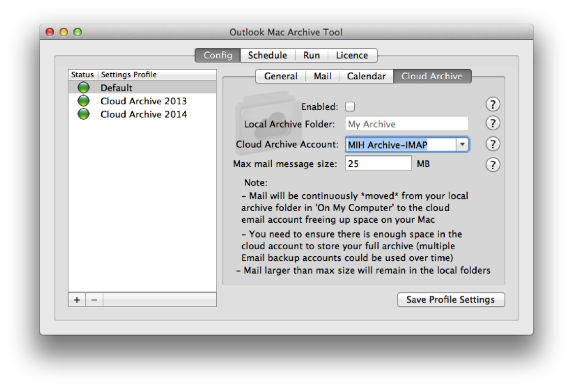 • Hi Brian, it has two archiving processes. It simply moves mail in it’s folders from your working online account down to ‘On My Computer’. The value of this is that it frees up your online account especially if it has storage quotas etc. This effectively all happens within the single identity and I agree that Outlook suffers from many identity corruption issues. This is why I wrote the ‘Cloud Archiving feature’ which basically moves mail from your ‘On My Computer’ to any other mail account of your choice. So for example if you setup a second account in Outlook mapped to a Gmail account via IMAP (e.g. myarchive.work.2014@gmail.com) it will archive (in realtime) from your working active account via On My Computer out to the cloud mail account. This cannot get corrupted as once it’s been uploaded in to GMail and your identity corrupts you simply install a fresh outlook and connect back up your working account (often exchange) and your archive Gmail account and they all come back down in to your new Identity from the cloud.