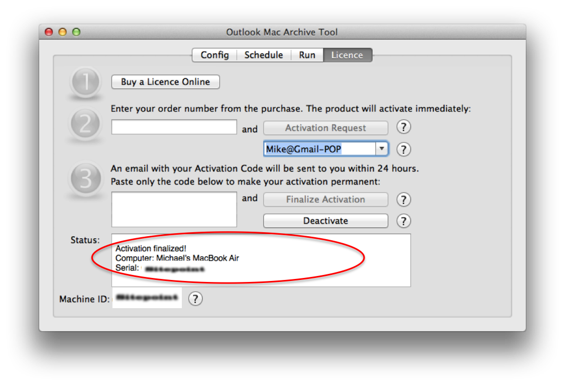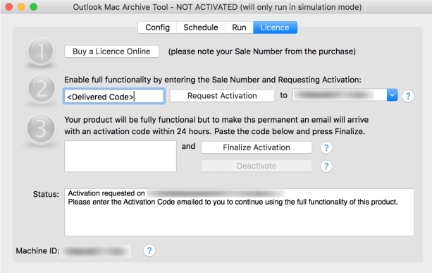 3) After requesting activation you will receive a licence key/activation code via email (within 24 hours). Once the key arrives enter it into the Outlook Mac Archive Tool application on the ‘Licence’ tab (Step 3) and press the ‘Finalize Activation’ button.