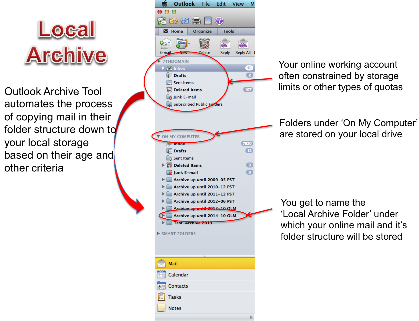 The solution is to begin to store your older (less referred to) email locally on your computer. In Outlook Mac the local storage folder is called ‘On My Computer’. ‘On My Computer’ is not shown in Outlook by default but you can easily show it by following this guide. The below diagram illustrates the Local Archiving process
